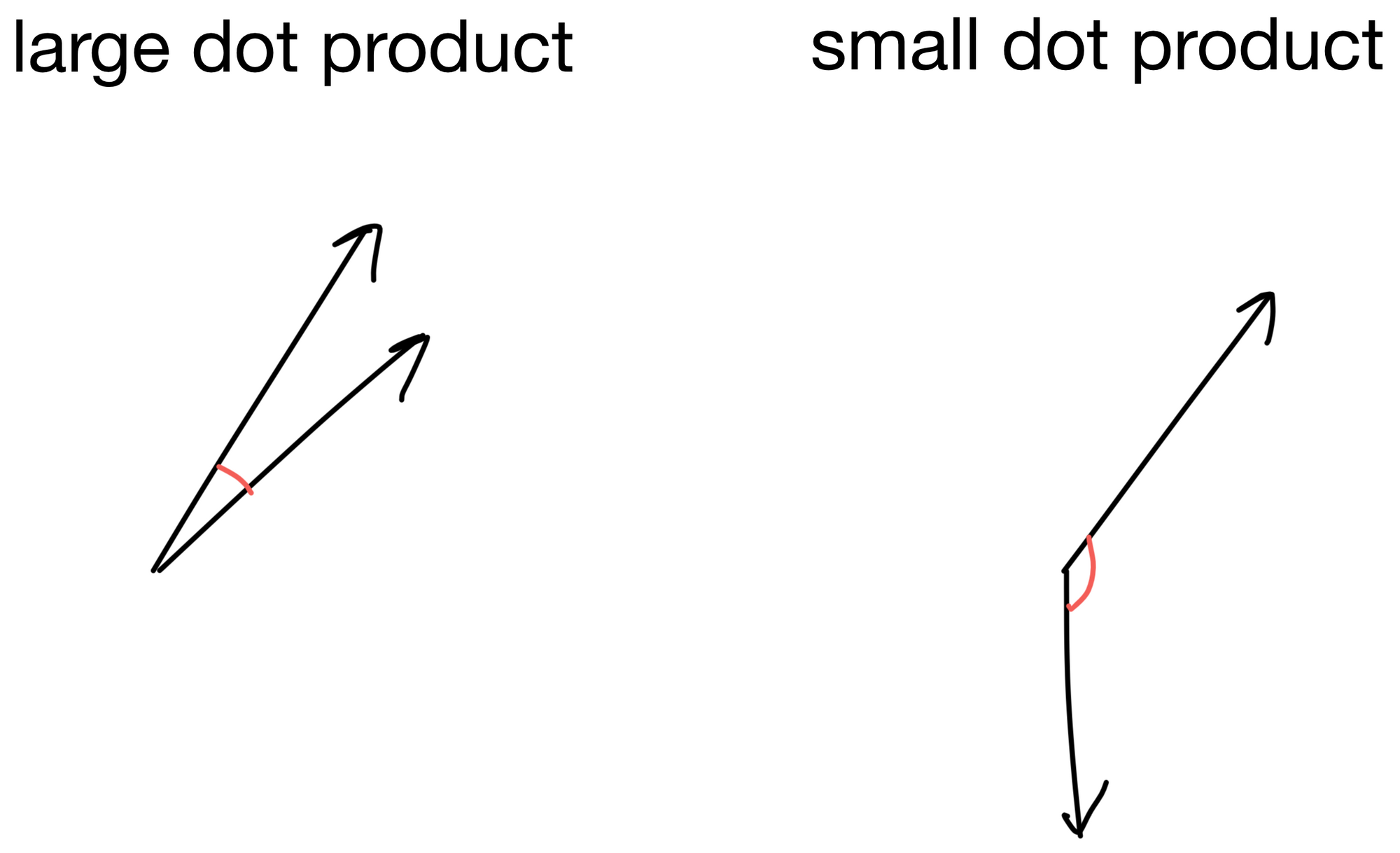 Before answering the above, let's quickly review what the dot product between two vectors represents. For two vectors whose direction is similar the dot product will be large, while for two vectors pointing in different directions the dot product will be small.