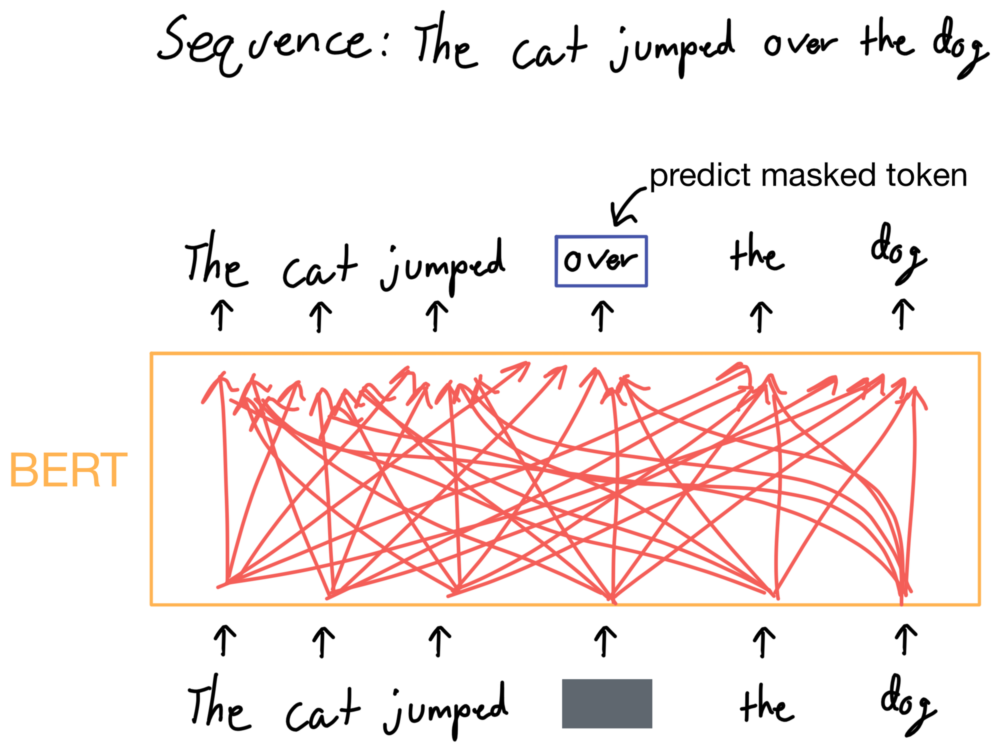 BERT solves this issue by slightly modifying the training task to allow the model to learn bidirectional representations. Instead of simply predicting what token comes next in a sequence, BERT masks random tokens in the input sequence and asks the model to predict what the masked token is. As a result, the model now has access to tokens in the input sequence that occur not only before, but after the masked tokens, allowing it to gather information from all tokens in the sequence.