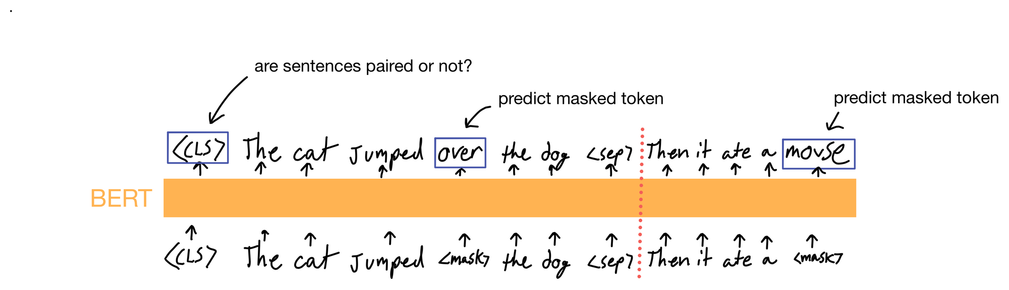 Token masking isn't the only change BERT implements in the self-supervised training objective. It also incorporates a binary classification task to predict whether two sequences are paired (i.e. next to each other in some input dataset). BERT incorporates this objective by inputing two input sentences, separated by a special <SEP> token, and predicts whether the sentences are paired or not. The actual prediction is made of a special <CLS> token that is concatenated to the front of the input tokens. This <CLS> token aggregates information via attention from all tokes in the input sequence, and is linearly projected for classification. This is an exceptionally powerful concept, and is a significant component of what allows BERT to fine-tune so well.