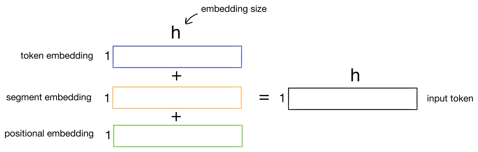 Finally, BERT also makes some changes to input token construction. It is common practice when training transformers to add a word embedding to a positional embedding to give the transformer context for where the token is in the input sequence. This is also done in BERT, except an additional segment embedding is also added. The segment embedding can take one of two possibilities and informs the model whether the token is part of the first or second sentence (i.e. before or after the <SEP> token) in the overall input sequence.