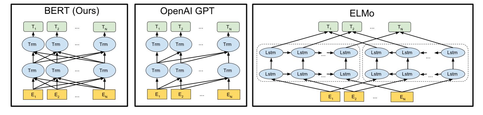 Below is a figure from the paper comparing BERT against GPT and ELMo[4]. I didn't explicitly mention ELMo above, but it is similar to GPT in that it auto-regressively predicts the next token in a sequence, except that there are two transformer encoders. One that "reads" left to right, and another from right to left. They are then combined to predict the desired token in the sequence. However, this architecture is still deficient in that it doesn't allow for the attention mechanism to mix information in the same encoder layer, as the left-right and right-left learning is happening in two separate encoders.