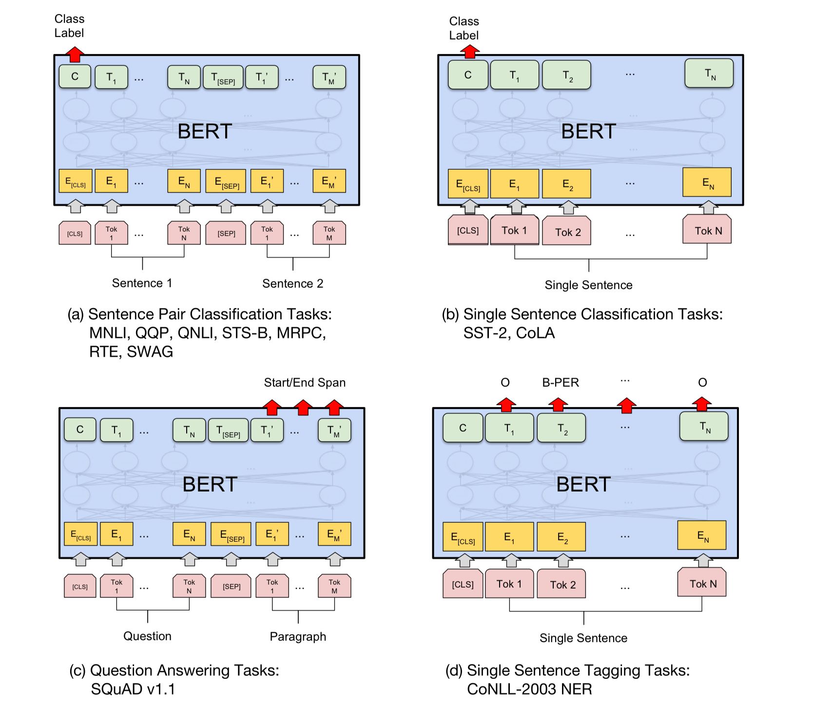 For each downstream task, task-specific inputs/outputs are applied to BERT. For example, in tasks such as sentiment analysis, the <CLS> token is used to classify the sentiment of an input sequence. Likewise, for tasks like sequence tagging, the token representations output by the encoder are used to classify a token as a particular tag. A visualization of some of these tasks is elegantly shown in the figure below from the paper.