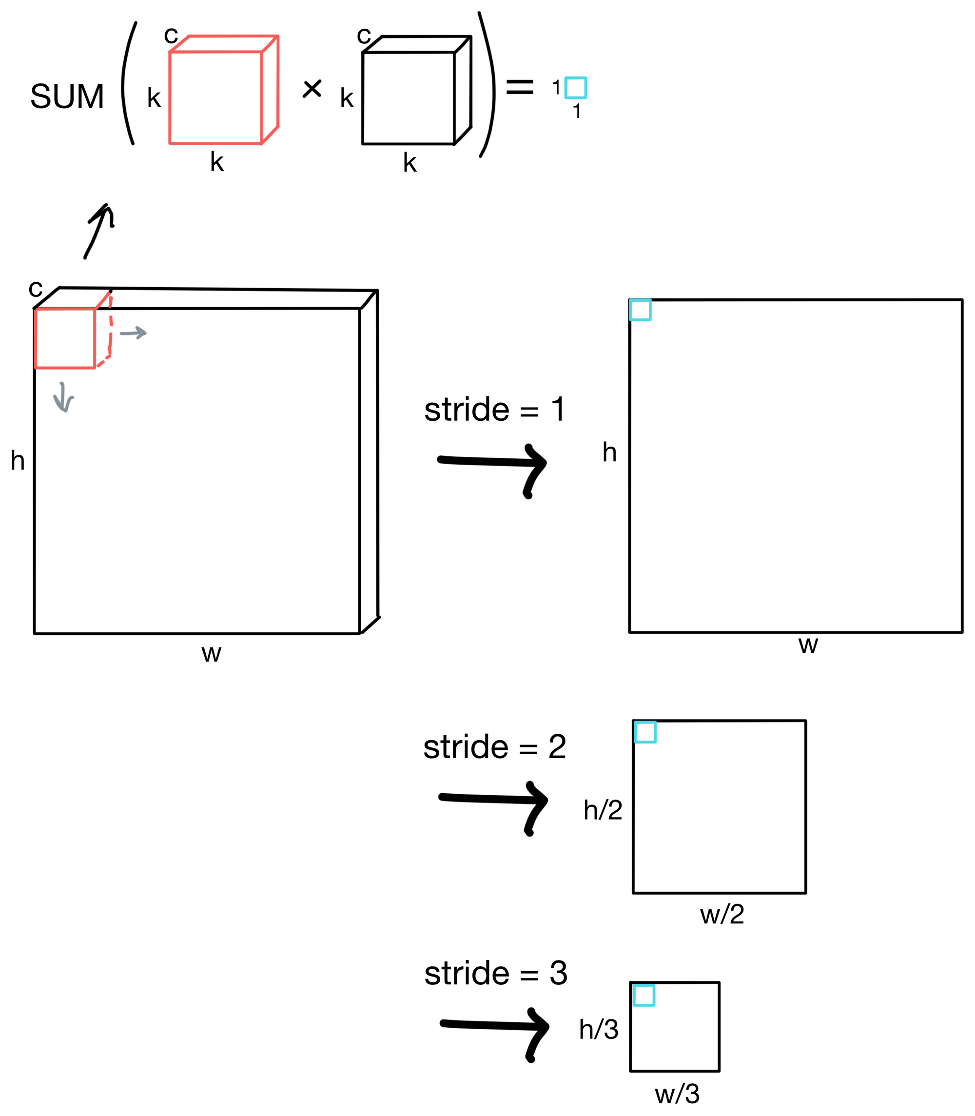 To build representations, each kernel (shown in red) is "slid" across the image. The amount a kernel is "slid" is called the stride of the convolutional layer. If a stride is 1, then the kernel is shifted by 1 pixel across the image, while for a stride of 3 the kernel would shift by 3 pixels across the image.