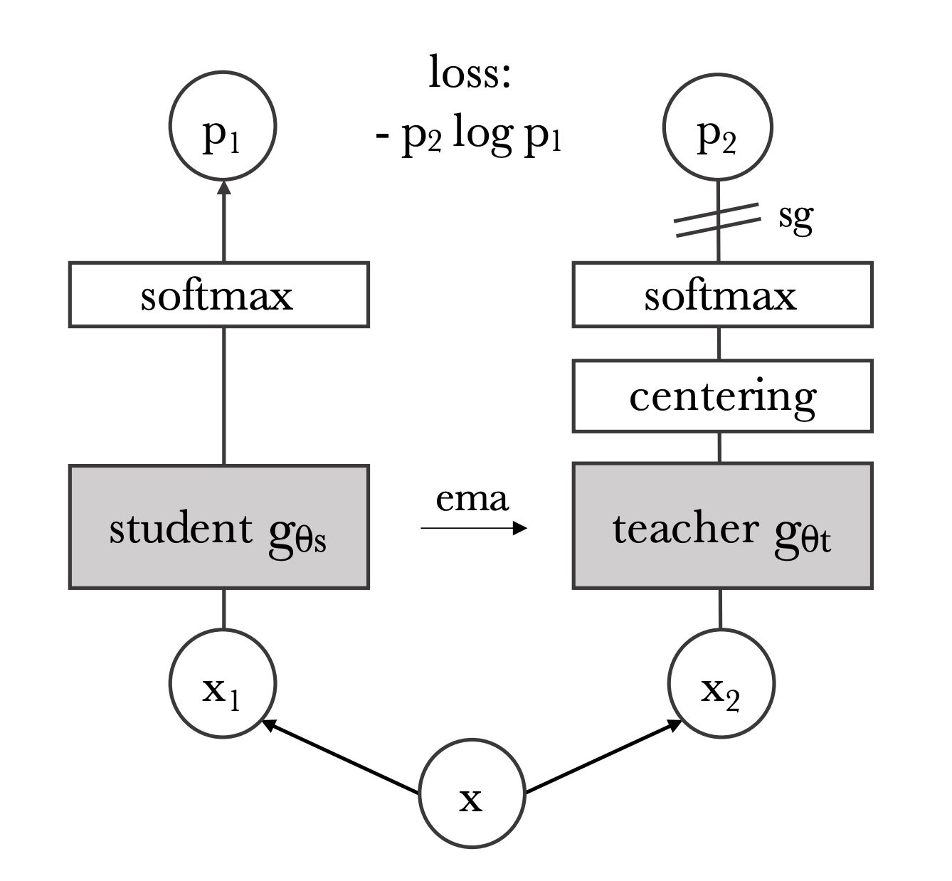 Now that we have our loss, we can update the network (Fig 4). The loss is only used to update the student parameters. It is not used to update the teacher parameters. After the student parameters are updated, an exponential moving average (EMA) of the student parameters are used to update the teacher parameters. The EMA prevents the teacher parameters from updating too quickly. After parameter updates the teacher also gets a new centering parameter.