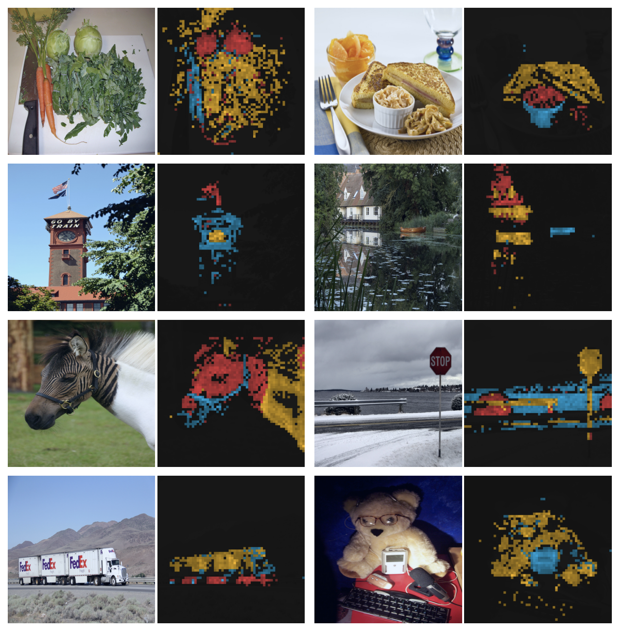 - Based on the inspection of ViT features, it's clear DINO can learn semantic representations from images. Specifically, when examining how the class token attends to the image patch embeddings there are stark features corresponding to scene layout, object boundaries, etc. (see figure from paper below). Related to this point, the authors also find it is beneficial to use smaller image patch sizes than traditionally used in vision transformers, which helps to more clearly resolve these features.