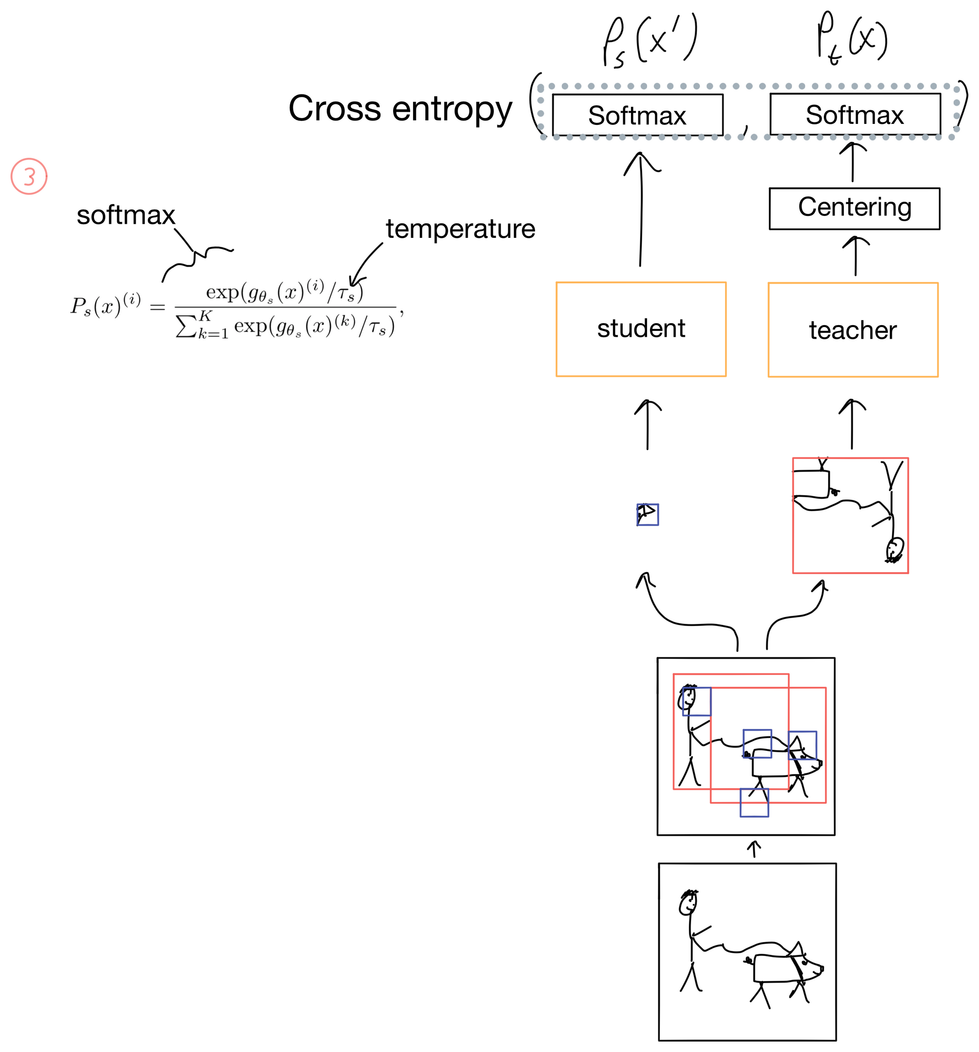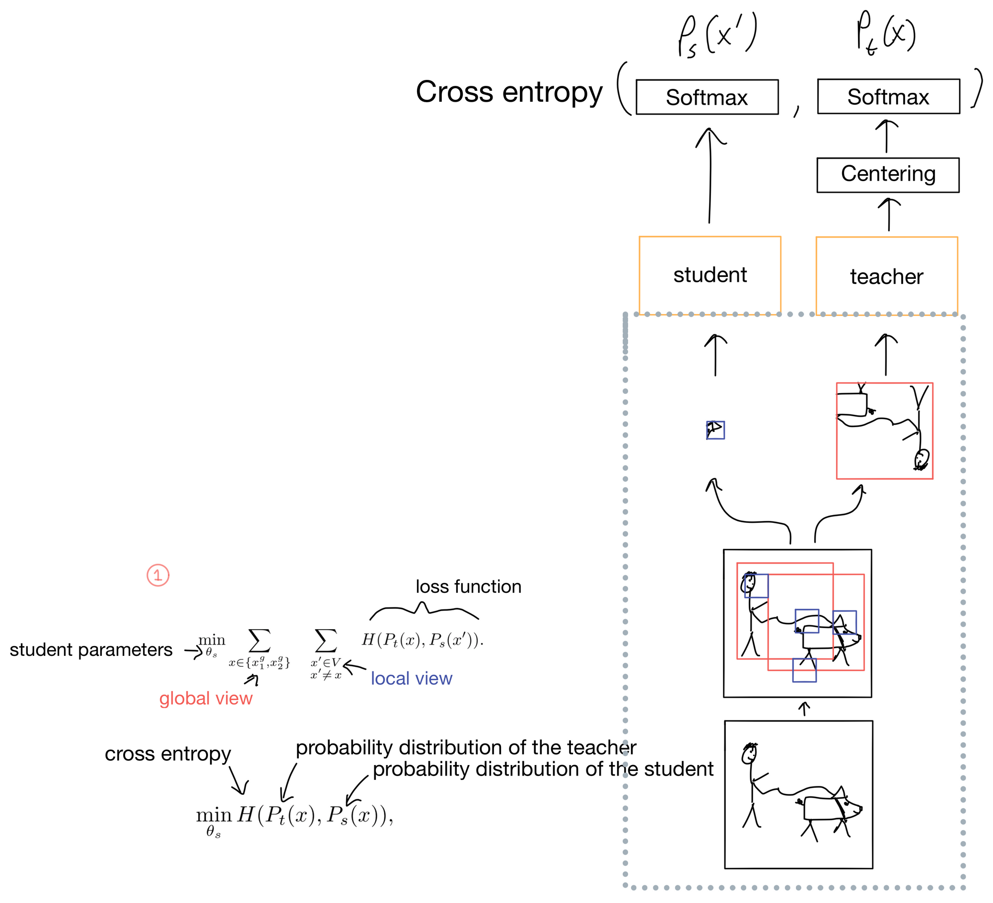 First an image is passed through two different random augmentation/transforms (Fig 1). The resulting two images are cropped into two different types of views: a local view covering <50% of the image (shown in blue), and a global view covering >50% of the image (shown in red). The teacher only ever get's the global crops, while the student can get either the local or the global crop of the separate image that is augmented differently than the teacher's image. This prompts the network to learn “local-to-global” correspondences in the image.