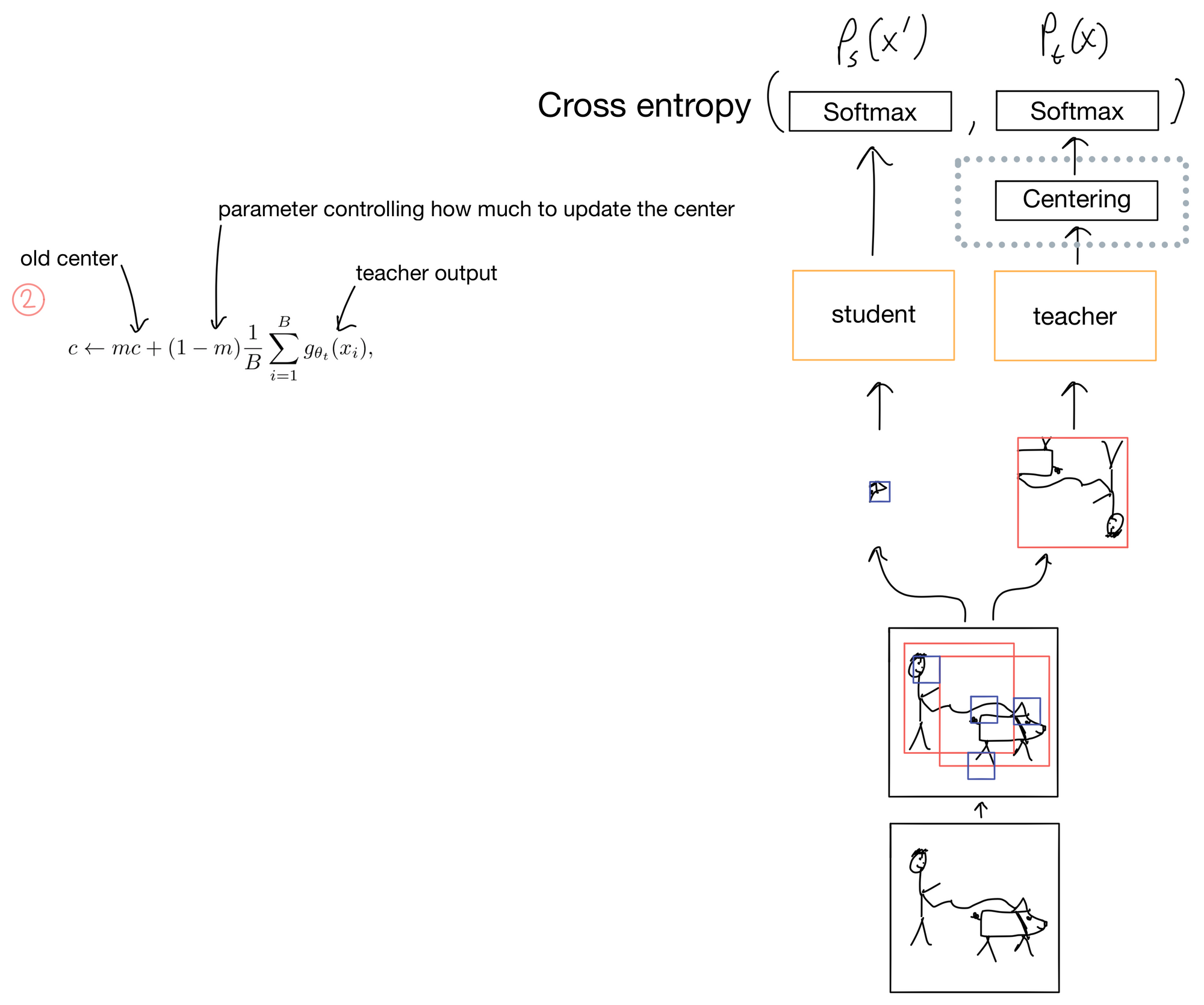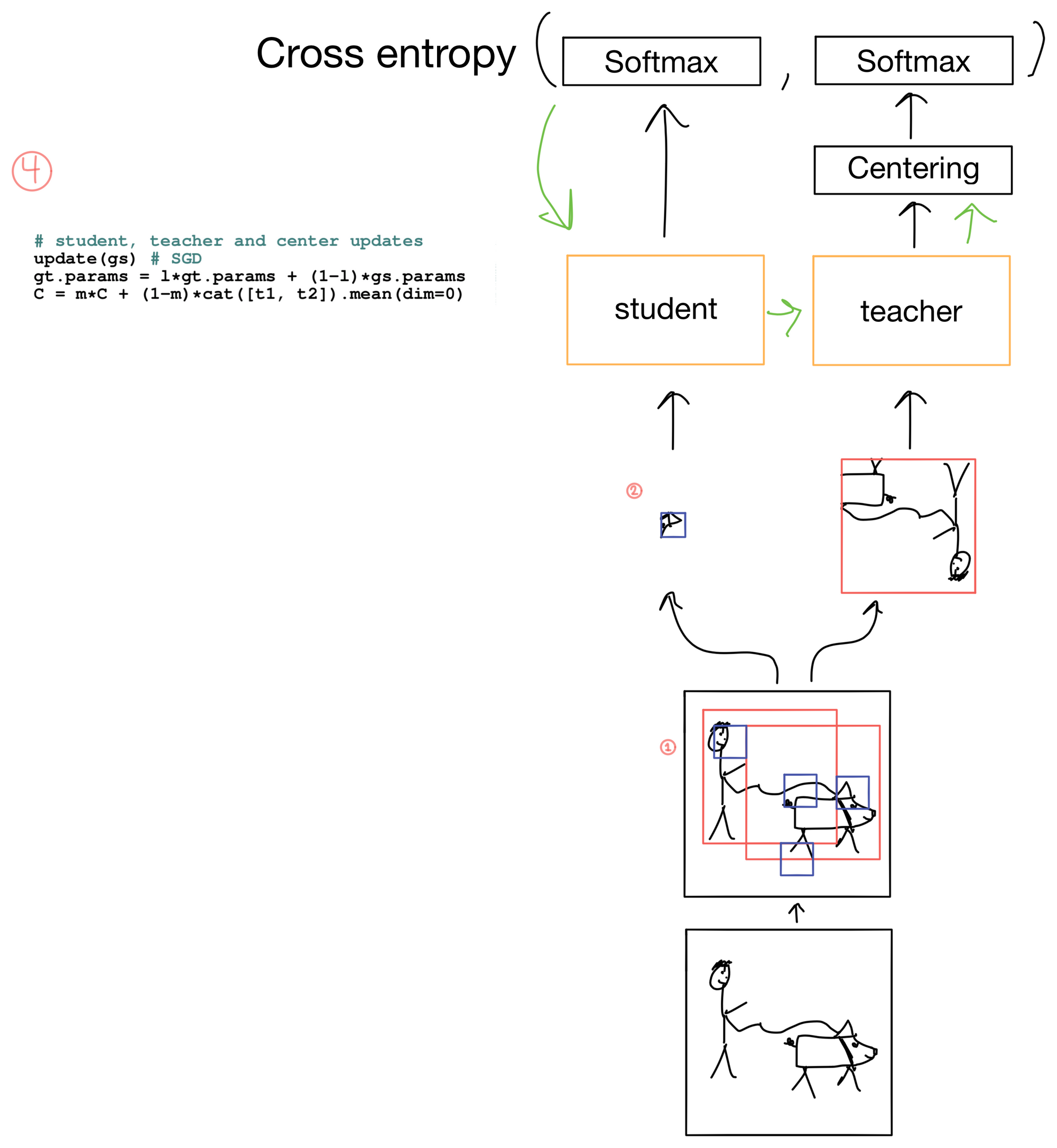 - Three main concepts, which I'll detail later in the post, allow the framework to function: 1) multi-crop training, 2) centering, and 3) a momentum encoder.