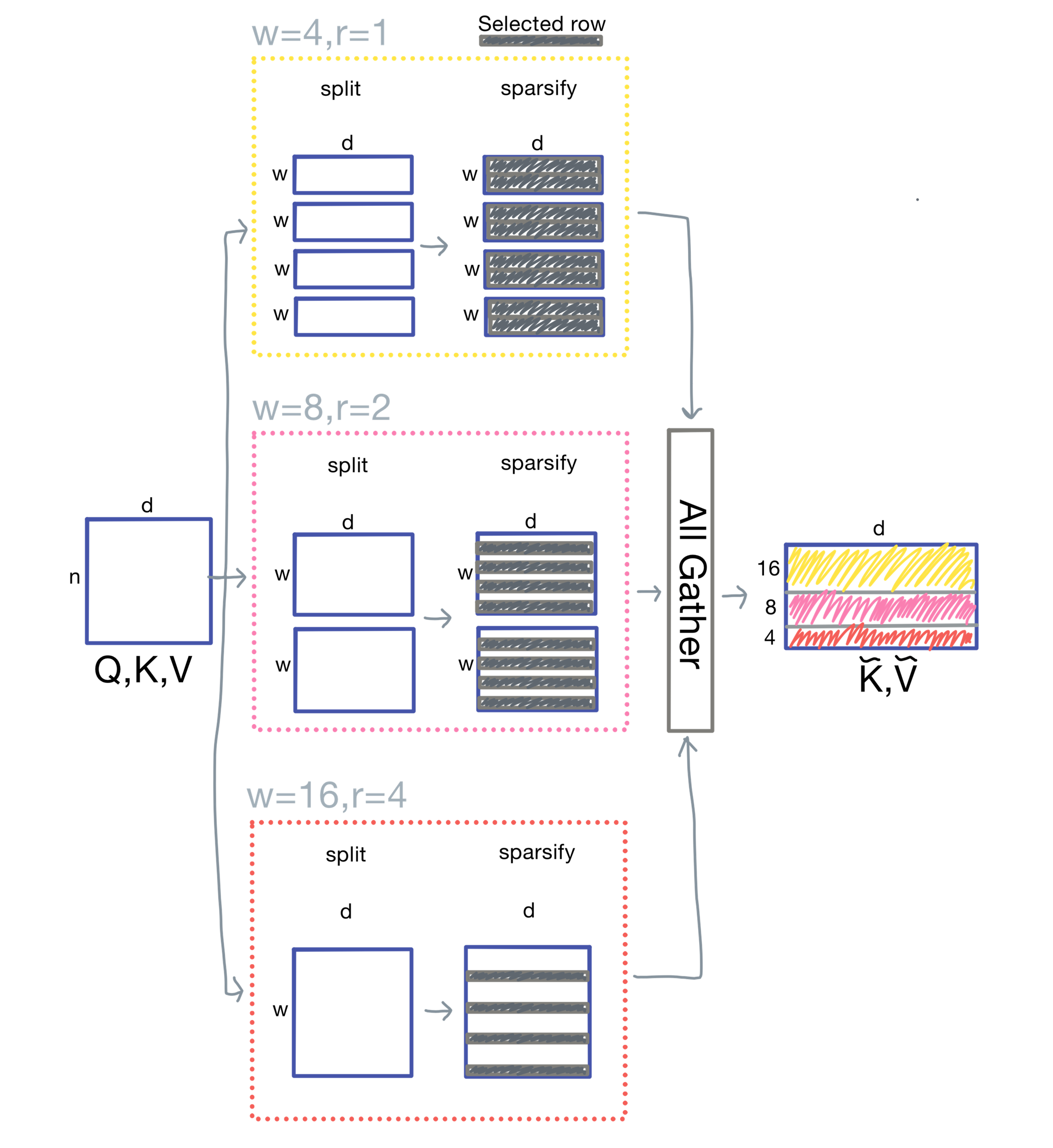 - Keys and values are sparsified and, in the case of K and V, gathered globally
