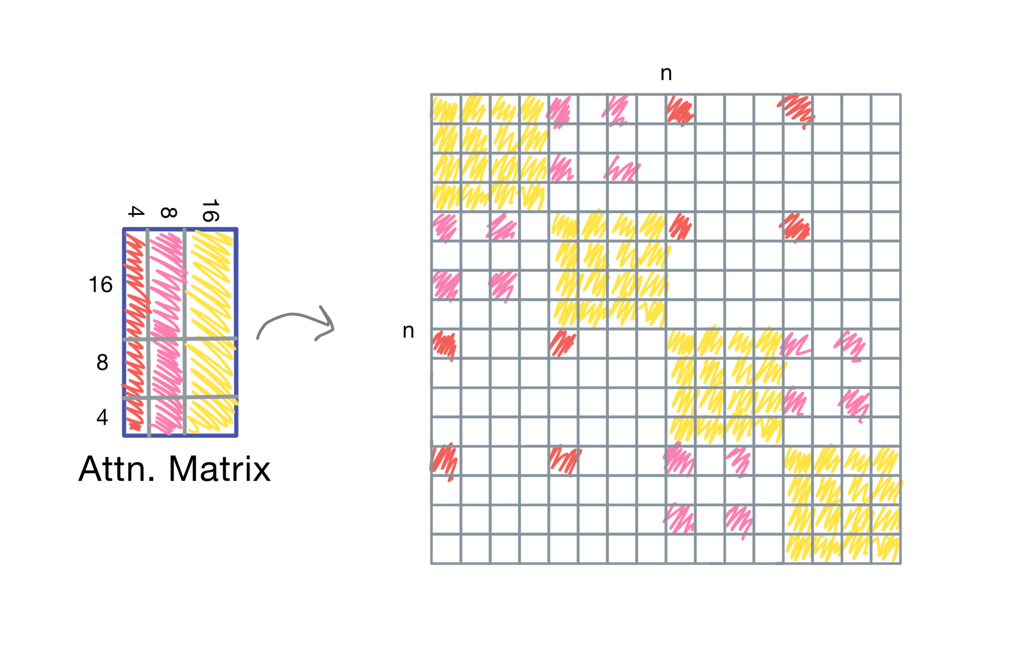 Here we can visualize which portions of the attention matrix are actually used when comparing to regular attention. Note that if we were performing an autoregressive task, we would need to mask the result of the attention computation so tokens can not attend to tokens that come after them in the sequence.