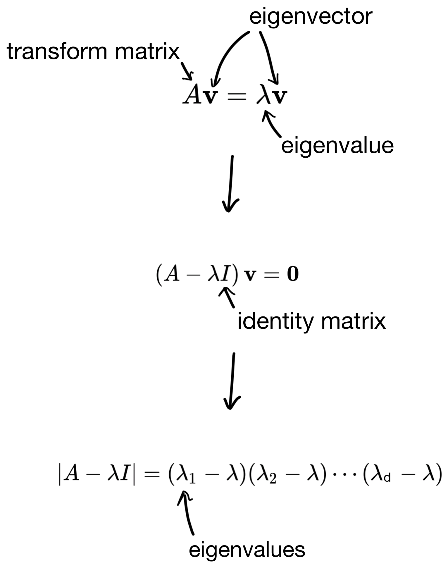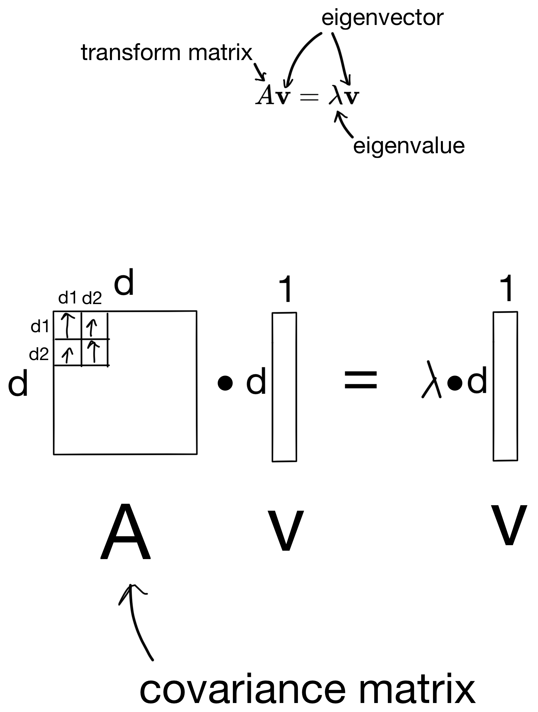 And then plug the eigenvalues back in to get the eigenvectors. The number of solutions to the equation is equivalent to the number of features in the dataset (i.e. the dimensionality of the covariance matrix). So in the end we end up with d eigenvector/eigenvalue pairs.
