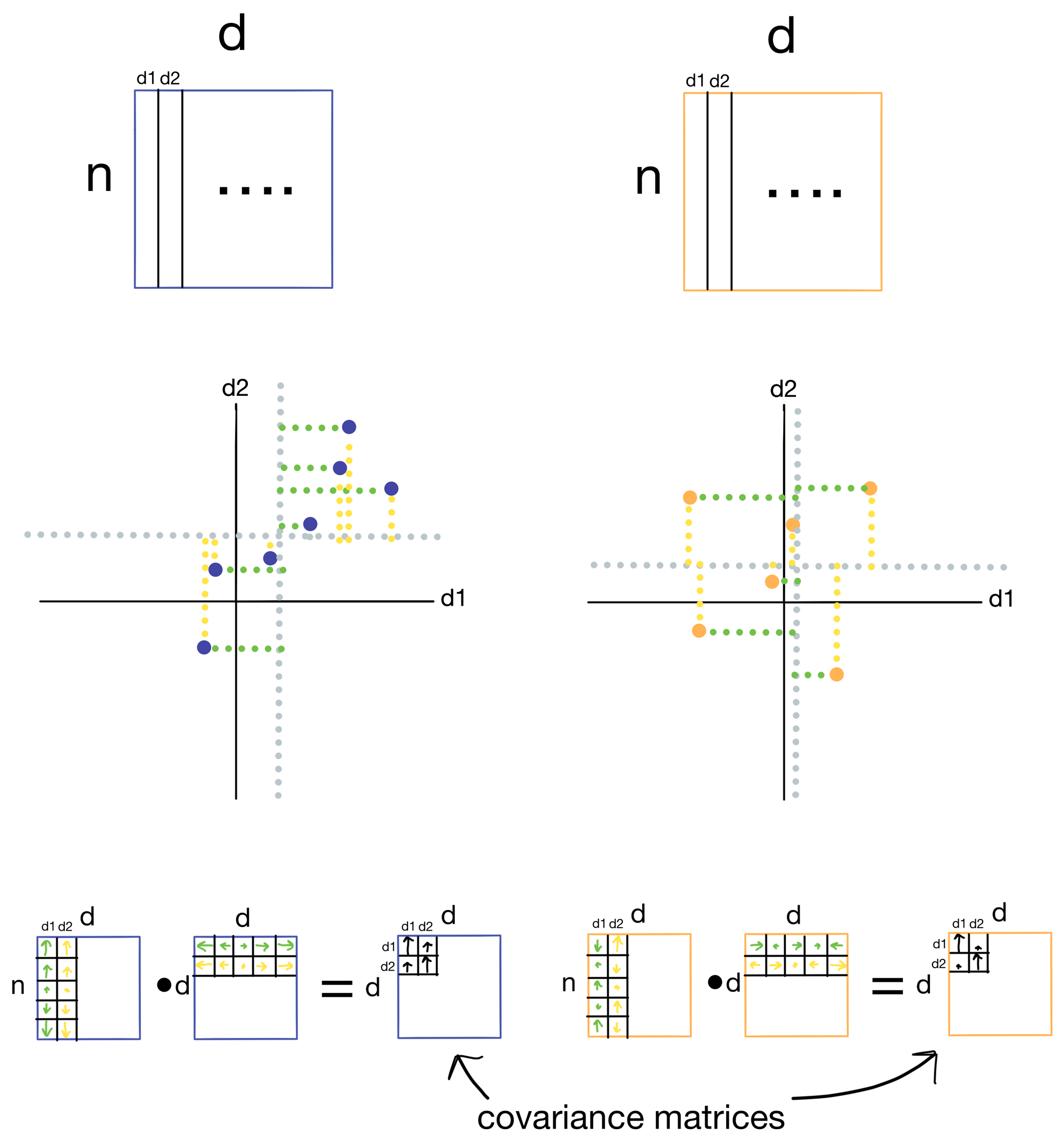 Covariance is a measure for how well two features vary with each other (think of it as an unnormalized version of correlation). Two features that vary in the same way will have high covariance, and two that don't will have low covariance. To calculate the covariance matrix we take the dot product of the residuals, which are the distances of each of the samples from the mean for a particular feature. Residuals for d1 are shown in green and residuals for d2 are shown in yellow for each sample (i.e. point) in the dataset. When the samples have residuals that tend to be in the same direction and magnitude, we get large covariance (blue), however, when they are not we get low covariance (orange). In the resulting covariance matrix each entry is the covariance for a given pair of features.