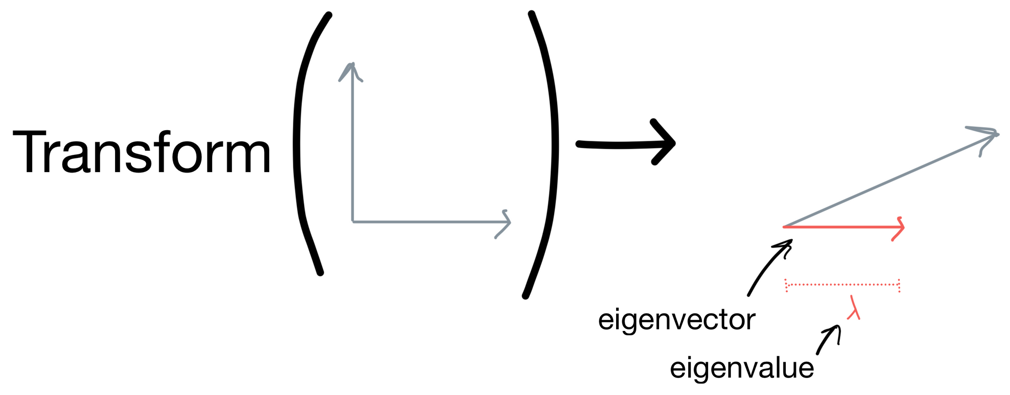 Let's get come intuition for this definition. Below is a set of vectors that have some transform applied to them. After the resulting transform they are stretched in some direction. The eigenvector is vector for which the direction stays the same (shown in red). The eigenvalue is the magnitude of this eigenvector.