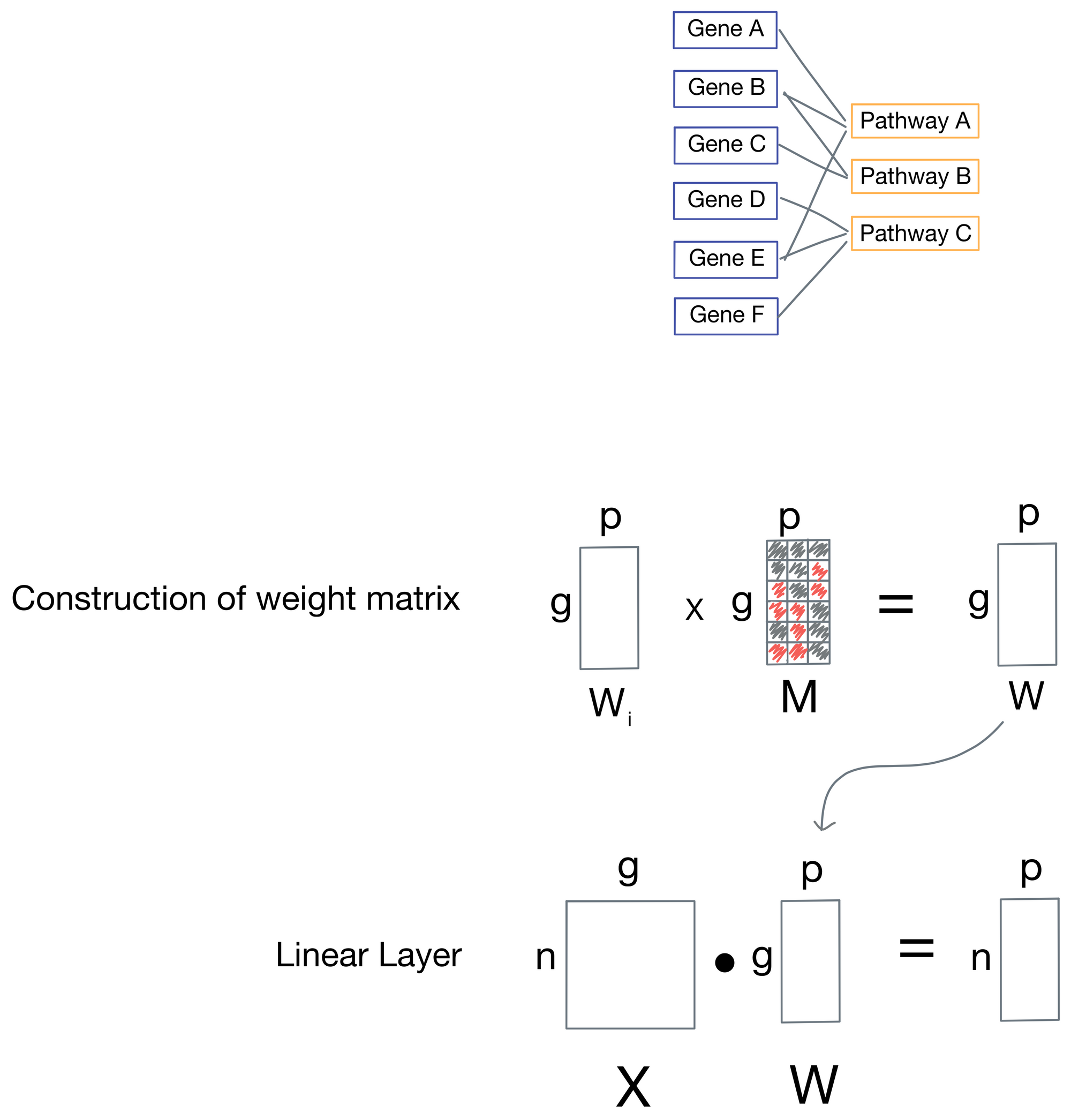 Now that we've enumerated the neural network architecture, how are the skipped connections implemented? It turns out to be fairly simple: for each weight matrix (one is associated with every layer), there is a corresponding mask matrix M that is used to set positions in the weight matrix representing connections to nodes that are not biologically relevant to zero.