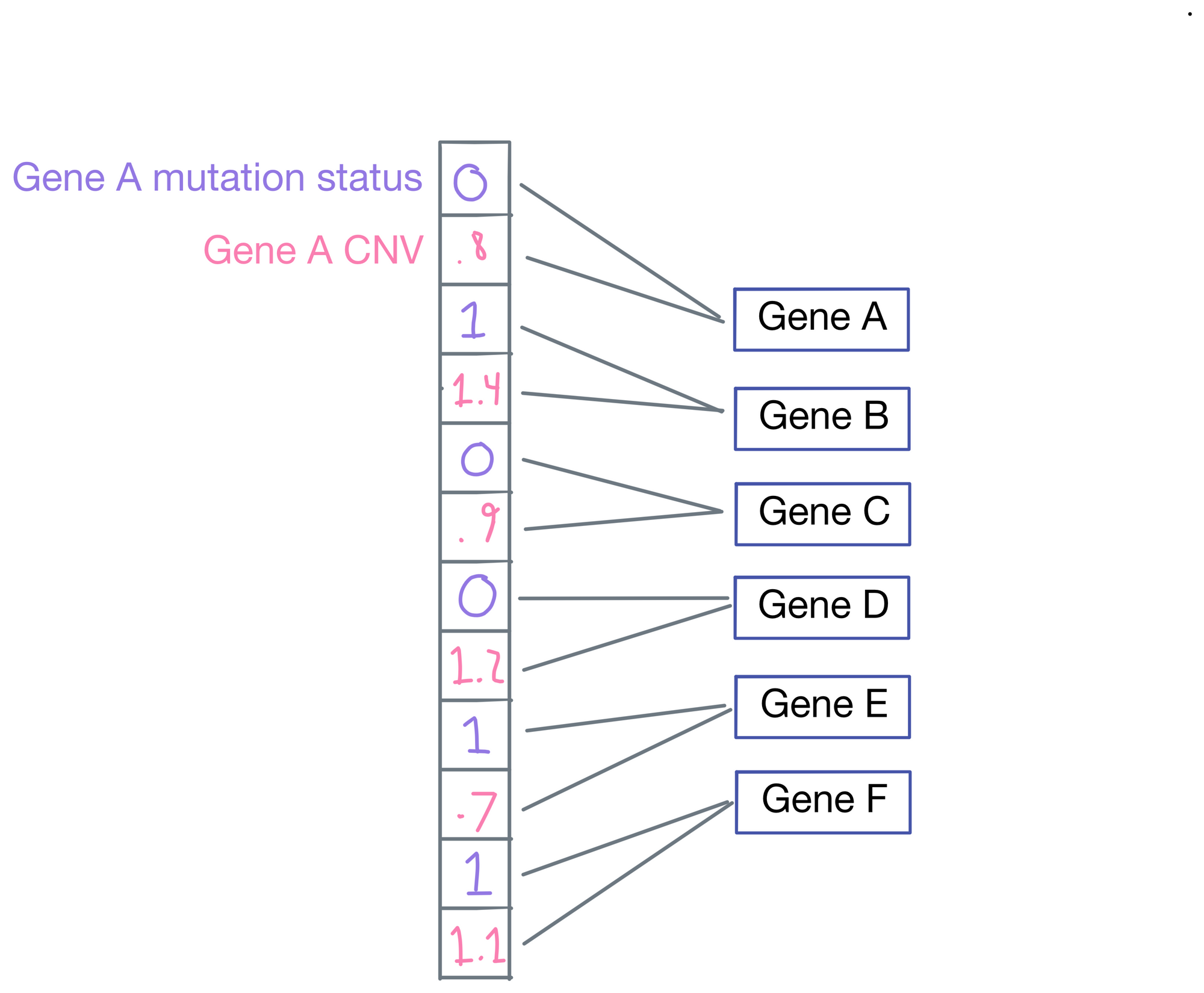 If we zoom in on the first layer, the network inputs are a vector representing mutation status (1 for mutated, 0 for wild type), and copy number (lower numbers are deletions and higher numbers are amplifications). Importantly, each input is only connected to its corresponding gene.